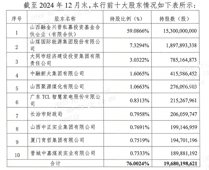 在股权结构方面,截至2024年底,山西银行第一大股东为山西融金兴晋私募投资基金合伙企业(有限合伙),持股比例为59.0866%。穿透后,这家合伙企业的实际控制人为山西省财政厅。这意味着,山西银行的第一大股东实际是山西省财政厅。