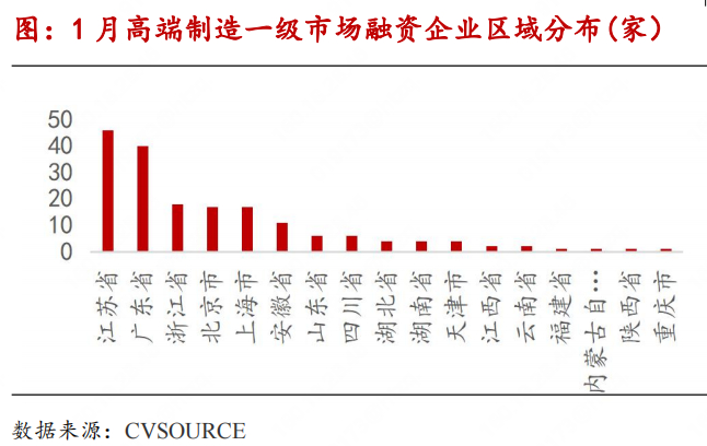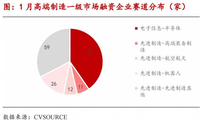 2025年1月,投中CVSOURCE数据统计,高端制造领域有181起一级市场投融资事件,数量上较24年1月有所下滑。半导体融资73起(7起披露详细融资额,融资金额共计约25亿人民币),航空航天融资12起(3起披露详细融资额,融资金额共计约6.6亿人民币),机器人融资26起(3起披露详细融资额,融资金额共计约7.15亿元),高端装备制造融资11起(1起披露详细融资额,融资金额共计约5000万元),其他融资59起(3起披露详细融资额,融资金额共计约3.7亿人民币)。