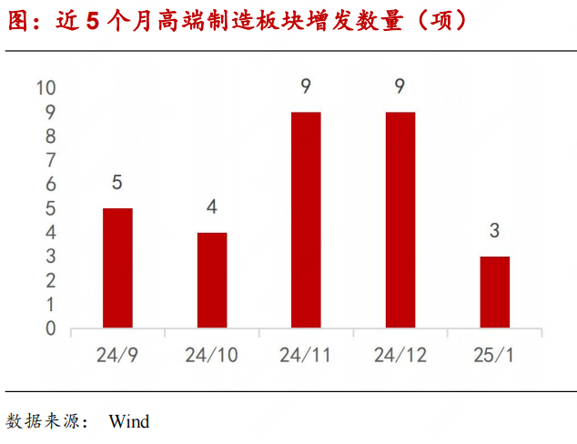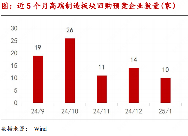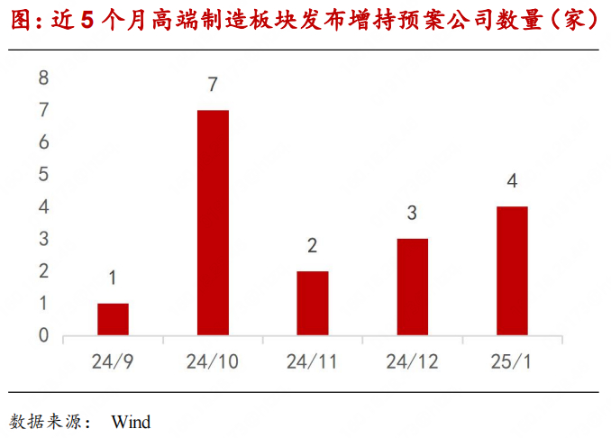 2025年1月,高端制造板块共计4家企业发布股份增持预案,分别是中航电测、中航机载、七一二及沪硅产业。整体数量上看,较2024年12月持平。
