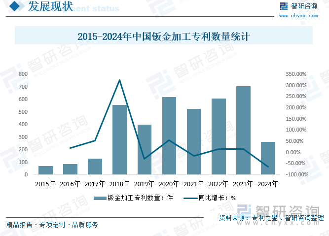 钣金加工工艺是钣金加工过程中必要的执行条件,是金属加工行业中的一个重要分支,也是提高制造工件效率和保证工件质量的重要标准。我国在设计和制造钣金工艺上已经实现了从0到1的突破,并在中低端市场占据有一定份额。目前我国的三维设计软件主要有PRO/E、CATIA等,并在钣金工艺的重要环节诸如三维设计、产品分析、仿真优化、数控加工、布线系统、数据管理等方面获得了长足的进步。幸运的是,我国的钣金工艺占据了大部分低端市场,并且在近期国内外机构联合研制中获取了一定技术份额。2015-2024年期间,我国钣金加工专利数量合计3973件,其中,2023年达到708件。目前我国大部分钣金机床制造商能够提供自动编程软件,并在海外也有自己的软件研发团队。随着我国现代化工业的迅速发展,钣金加工工艺也是在理论与实践过程中进行着逐步的完善。