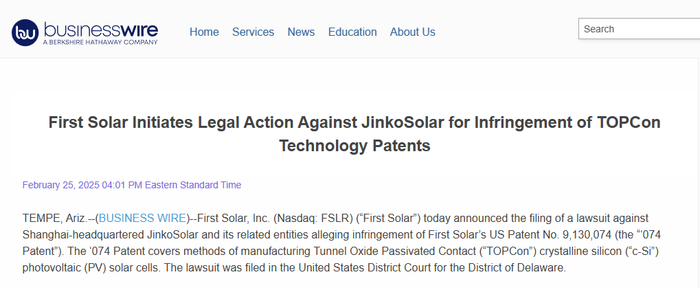 最新消息,First Solar在美国起诉晶科能源,指控其侵犯TOPCon专利。