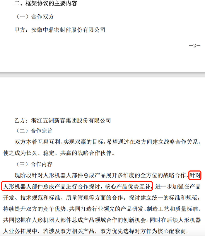 2月12日,五洲新春发布公告,与中鼎股份签订《战略合作协议》,该协议显示,现阶段针对人形机器人部件总成产品展开多维度的全方位的战略合作,针对人形机器人部件总成产品进行合作探讨,核心产品优势互补,共同挖掘在人形机器人部件总成产品领域的合作创新机会,若涉及双方相关产品,双方优先选择对方作为核心配套商