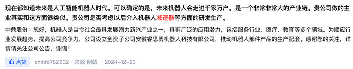 看起来两家公司似乎并没多少合作点,但是,中鼎股份与五洲新春一样,中鼎股份在机器人领域也有所布局,2024年底曾在互动平台表示“公司设立全资子公司安徽睿思博机器人科技有限公司,推动机器人部件产品的生产配套”。
