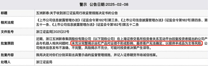 另外,本月初,五洲新春还因在互动平台回复投资者“未充分完整揭示丝杠产品对业绩不形成影响、最终客户无法确定、以提供半成品为主等风险”,被浙江证监局出具警示函。