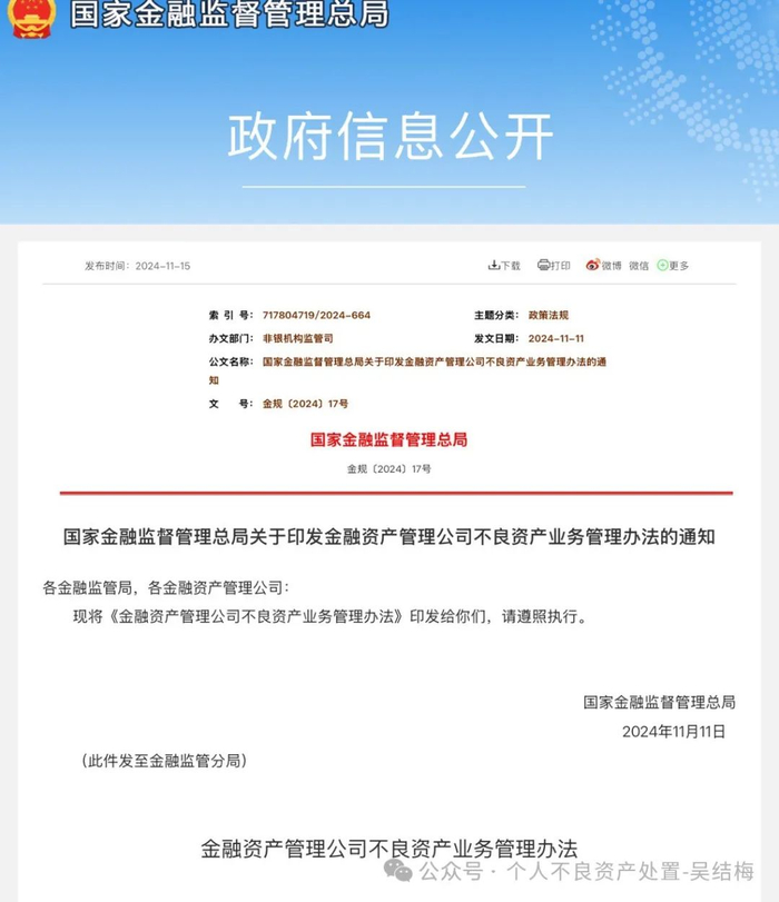 下图所示是国家金融监督管理总局2024年11月11日公布的《金融资产管理公司不良资产业务管理办法》👇👇