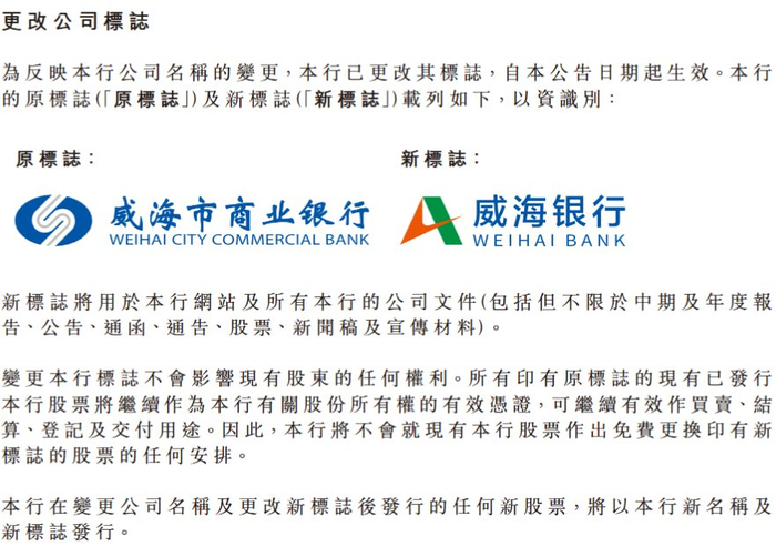威海商业银行正式更名为“威海银行股份有限公司” 公司章程及公司标志均已修改