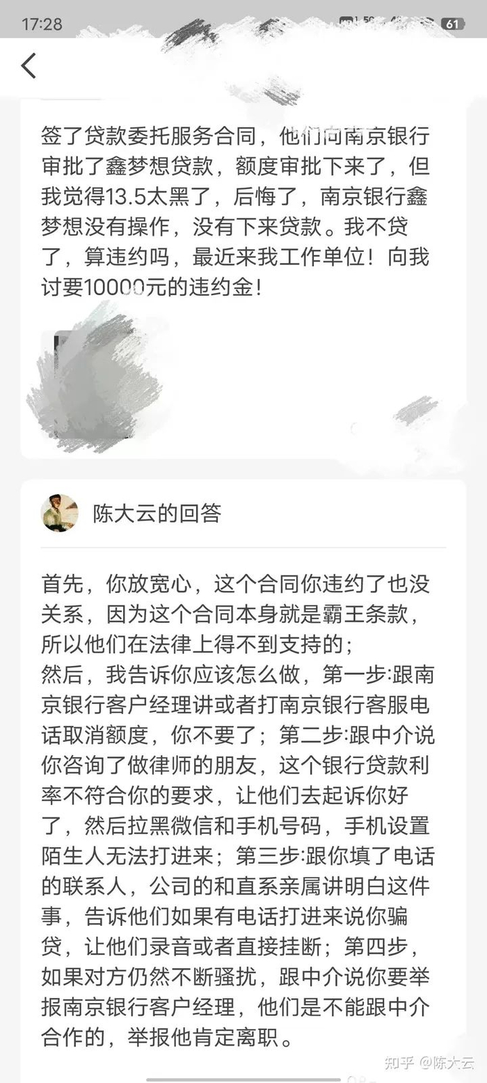 小哥是南京银行鑫梦想贷款额度审批下来了觉得被收13.5%的手续费有些太高了,不想要了,我让小哥跟贷款中介讲直接投诉南京银行客户经理,中介就不敢继续骚扰了,然后也完美解决了。
