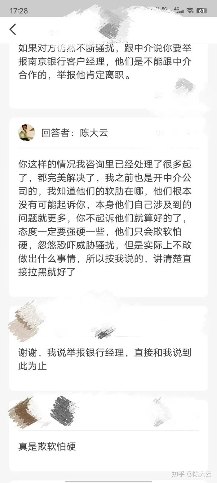 这个时候,如果你在之前办理贷款的过程中接触过银行的客户经理的话,你可以保留相关证据,告知中介你如果还要骚扰的话我就去举报这个银行客户经理,