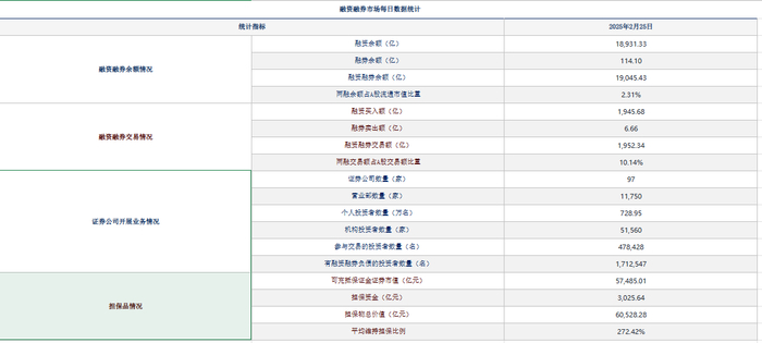 目前,中证数据披露了2月24日、2月25日的融资融券数据。如下所示2月25日情况,一共披露“融资融券余额情况、融资融券交易情况、证券公司开展业务情况以及担保品情况”四大类数据,包括18项具体指标。
