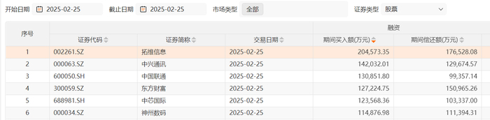此外,根据东方财富Choice金融终端数据,两市共有3402只个股有融资资金买入,其中拓维信息、中兴通讯、中国联通排名前三,买入金额分别为20.46亿元、14.2亿元、13.09亿元。