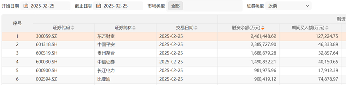 融资余额方面,东方财富、中国平安、贵州茅台、中信证券排名前四,均超过百亿元。东方财富以246.14亿元居首,中国平安以238.57亿元紧随其后。