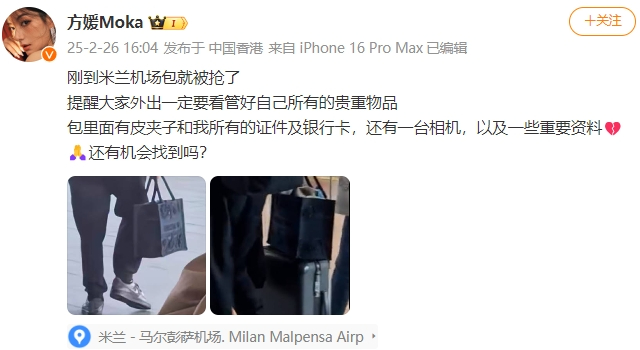 2月26日下午,郭富城妻子方媛发文透露刚到米兰机场就被抢走了包包,包里面有皮夹子和她所有的证件及银行卡,还有一台相机以及一些重要资料。