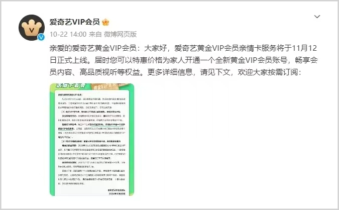 不止于此,爱奇艺还在10月底颁布会员新规:增加一个黄金VIP亲情卡服务,可用特惠价格开通一个全新黄金VIP账号;11月12日后的新会员账号可在5台设备上登录,但同时可播放的设备数从之前的2台调整为1台。