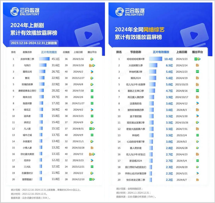 云合数据亦佐证,2024年上新的长剧集中,正片累计有效播放量TOP5《庆余年第二季》《与凤行》《墨雨云间》《繁花》《玫瑰的故事》,全部出自竞品之手。爱奇艺制作的《唐朝诡事录之西行》《南来北往》《我是刑警》《追风者》分别位居第六、七、八、十位。