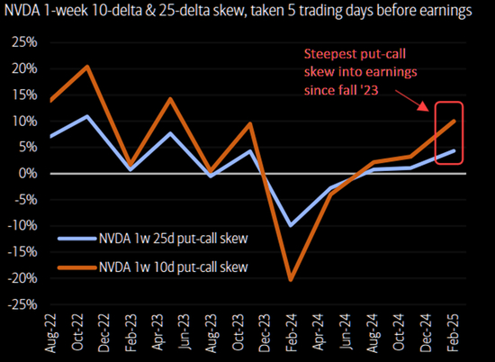 英伟达财报发布前的看跌/看涨期权偏度(put-call skew)达到了2023年以来的最陡峭水平。