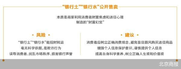 而当北京商报记者询问商家关于“银行水”的质检报告、水源证明等关键信息时,大多数商家要么含糊其词,要么直接拒绝提供。北京寻真律师事务所律师王德悦指出,“银行土”“银行水”等商品的流行,本质上是商家利用消费者的财富焦虑和迷信心理,通过玄学包装和营销策略制造的“财富幻觉”,电商平台和社交媒体的算法推荐也助推了这类商品的曝光率,消费者通过购买这些迷信商品来寻求心理上的慰藉,缓解对未来的不确定性。