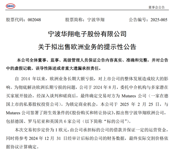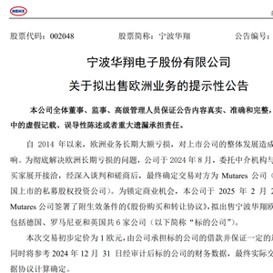 2月26日,宁波华翔公告称,公司拟出售包括德国、罗马尼亚和英国共6家欧洲公司,初步定价为1欧元,由公司承担标的公司的借款并保证一定的运营资金,最终实际交割价格依据协议计算确定。本次交易预计会对宁波华翔2025年财务报表产生较大影响,但从长远来看,有利于公司的未来发展和价值提升。