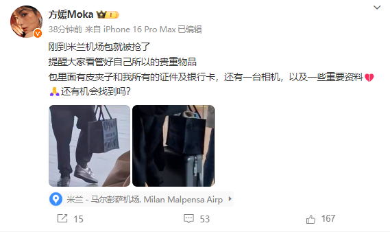 2月26日,郭富城的妻子方媛发布微博,表示:“刚到米兰包就被抢了,提醒大家看管好自己的所有贵重物品,包里面有皮夹子和我所有的证件及银行卡,还有一台相机,以及一些重要资料。还有机会找到吗?”