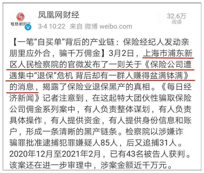 上海市浦东新区人民检察院的官微发布过一则关于《保险公司遭遇集中“退保”危机 背后却有一群人赚得盆满钵满》的消息,揭露了保险业退保黑产的真相。