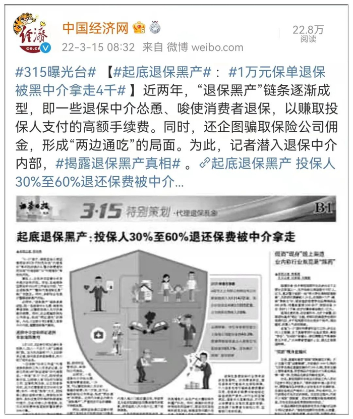 几乎在一夜之间,各种不法分子就开始针对保险业进行恶意误导和抹黑,随之而来的是形形色色的退保黑中介穿梭于大街小巷,出现在各大社交平台,可谓是触目惊心、无孔不入。
