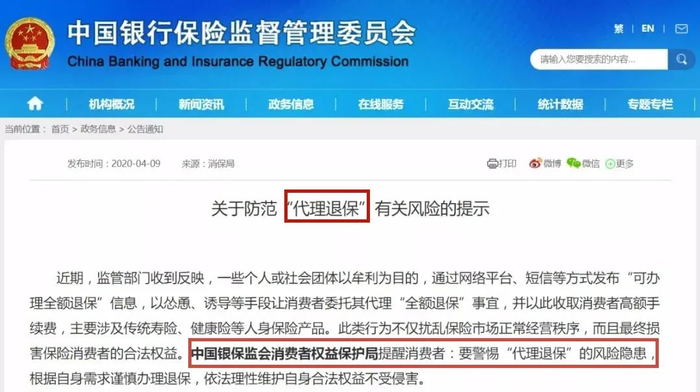 监管部门早在2020年就发布过公告提示《关于防范“代理退保”有关风险的提示》,提醒消费者别上“代理退保”的当。
