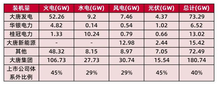 大唐集团主要业务涵盖电力、煤炭、煤化工、商贸物流等。集团下属电力上市平台为上海电力、吉电股份、中国电力、电投产融、电投能源、远达环保。目前集团共有装机180.74GW,其中火、水、风、光分别占比59%、15%、17%、9%;未上市装机量为72.49GW,占比为40%。