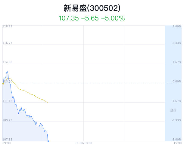 02月27日,新易盛(300502)股价大幅下跌,截至10点37分,新易盛下跌5.00%,报107.35元/股,成交24.35亿元,换手率3.48%,振幅6.19%。