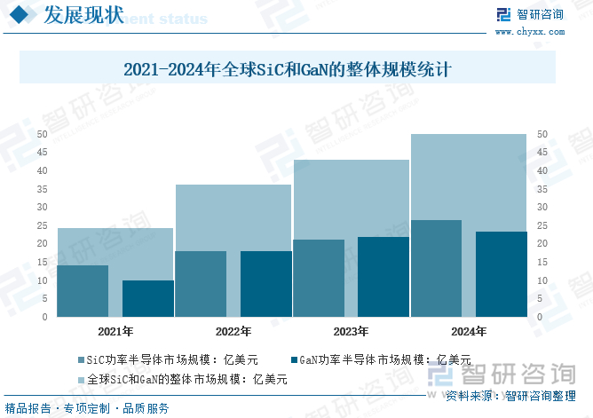 近年来,全球SiC和GaN材料的市场规模呈现逐年增长趋势,2023年全球SiC和GaN的整体市场规模约43亿美元。在混合动力和电动汽车、电源和光伏逆变器等需求的推动下,2024年,全球SiC和GaN功率半导体市场规模约为50亿美元。