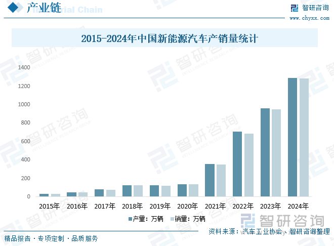 第三代半导体材料因具有高频、耐高压、耐高温、抗辐射能力强等优越性能使得它们在新能源汽车中有着广泛的应用,不仅可以提升整车的能源传输和转换效率,还可以促进新能源汽车的产品升级换代。近年来,我国新能源汽车产销量逐年增长,2024年,新能源汽车产销量持续攀升,均突破1000万辆,产销量分别达到1288.8万辆、1286.6万辆。