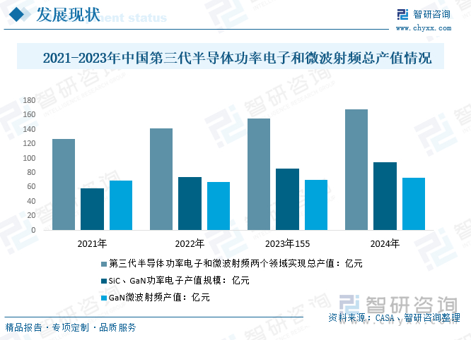 初步核算,2023年我国第三代半导体功率电子和微波射频两个领域实现总产值155亿元。其中,SiC、GaN功率电子产值规模达85.4亿元,GaN微波射频产值为70亿元;2024年我国第三代半导体功率电子和微波射频两个领域实现总产值大约168亿元。其中,SiC、GaN功率电子产值规模约95亿元GaN微波射频产值约73亿元。