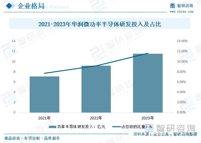 在功率半导体领域,华润微多项产品的性能、工艺居于国内领先地位,华润微已具备较强的产品技术与制造工艺能力,形成了先进的特色工艺和系列化的产品线,华润微研发费用逐年增加,高研发投入奠定了工艺技术优势基础。2021年至2023年,华润微研发投入分别为7.13亿元、9.21亿元、11.54亿元、,占营业收入的比例分别为7.71%、9.16%和11.66%。