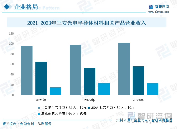 三安光电是国内化合物半导体领域技术实力雄厚、高知名度的企业,2023年,三安光电的化合物半导体营业收入102.03亿元,较2022年增加3.86亿元;LED外延芯片营业收入56.65亿元,较2022年增加3.36亿元;集成电路芯片营业收入23.07亿元,较2022年增加0.32亿元。