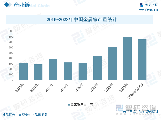 金属镓是第三代半导体制造的重要原材料,芯片、5G、新能源汽车都要用到它,我国是全球金属镓的最大生产国,主要供应美国、欧盟、日本和韩国等发达经济体。2023年我国金属镓产量801吨,较2022年增加186吨;2024年前三季度,我国金属镓产量为756吨。