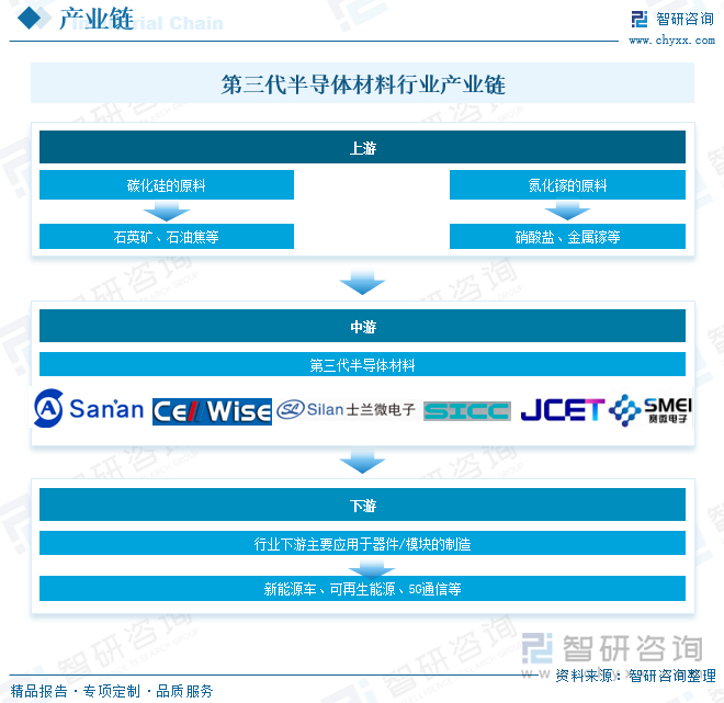 第三代半导体材料行业产业链上游主要包括碳化硅的原料石英矿、石油焦,氮化镓的原料硝酸盐、金属镓;行业中游为第三代半导体材料生产;行业下游主要应用于器件/模块的制造,半导体产品终端应用于新能源车、可再生能源、5G通信等各个领域。