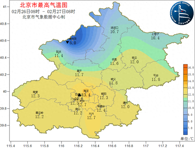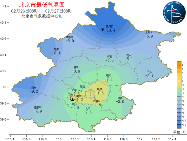 昨日(26日08时至27日08时),南郊观象台最高气温12.4℃ (15:30),最低气温 -1.8℃ (03:18)。