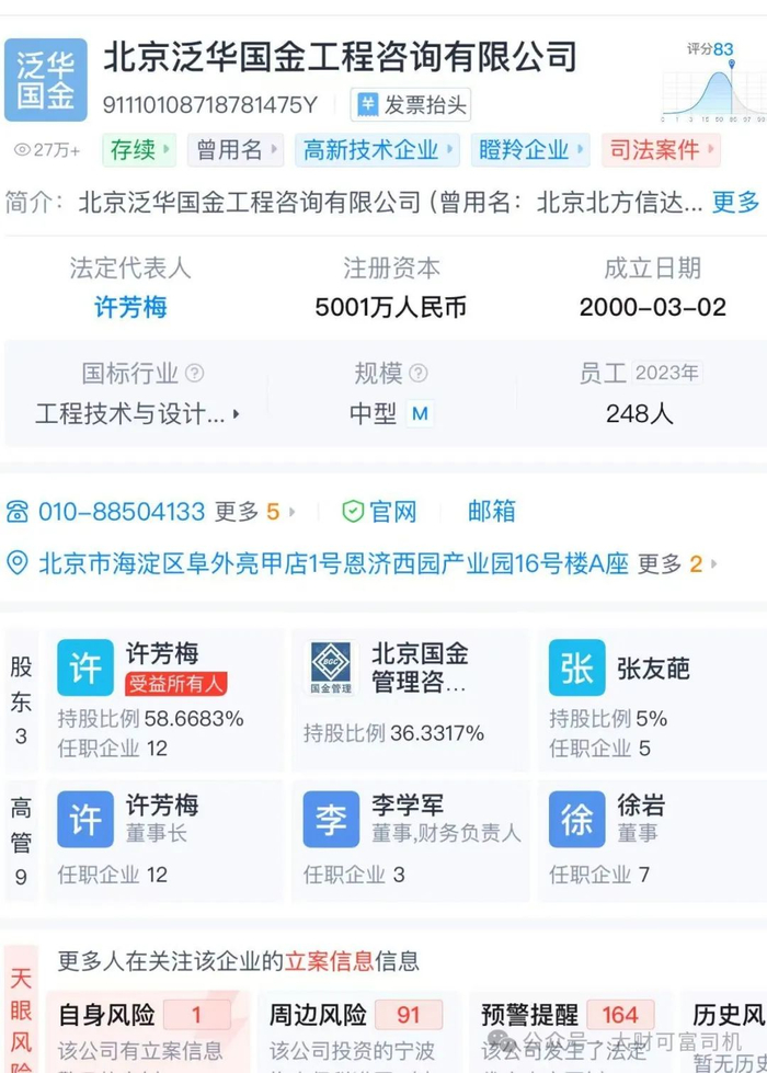 天眼查显示,北京泛华国金工程咨询成立于2000年,专业从事工程造价咨询、招标代理和工程项目管理,法定代表人许芳梅,持股59%。公司员工超200人。公司官网显示,其项目管理按投资额的1%-3%收费。