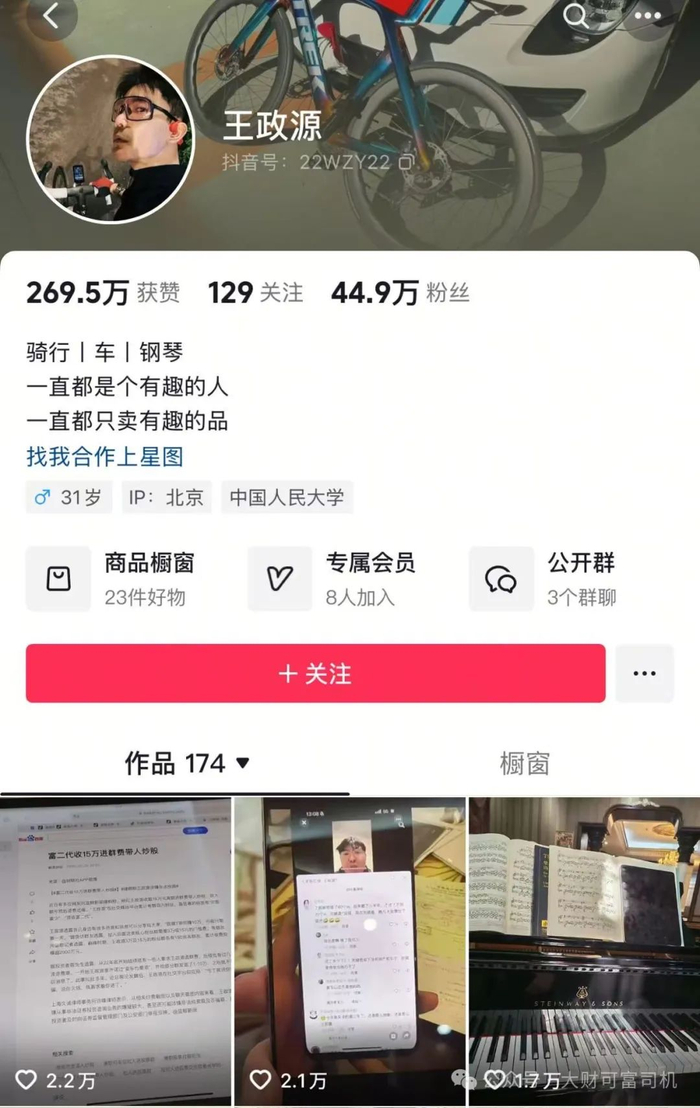 日前,有多位网友爆料称,王政源利用其网络影响力,开设多个收费粉丝群,以带人炒股为饵,收取高额入群费。