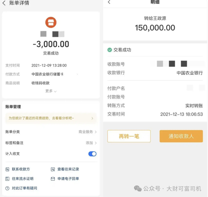 从粉丝晒出的转账记录可以看到,这位粉丝2021年12月向王政源转账3000元,几天之后又转账15万元进入到所谓的VIP核心群。