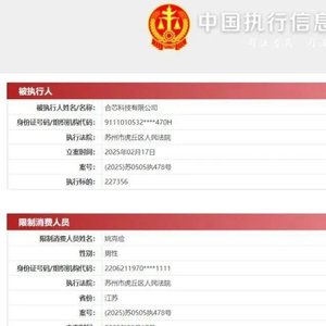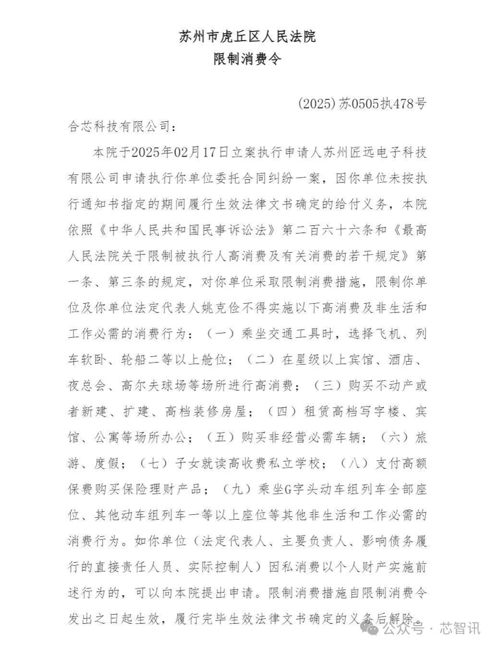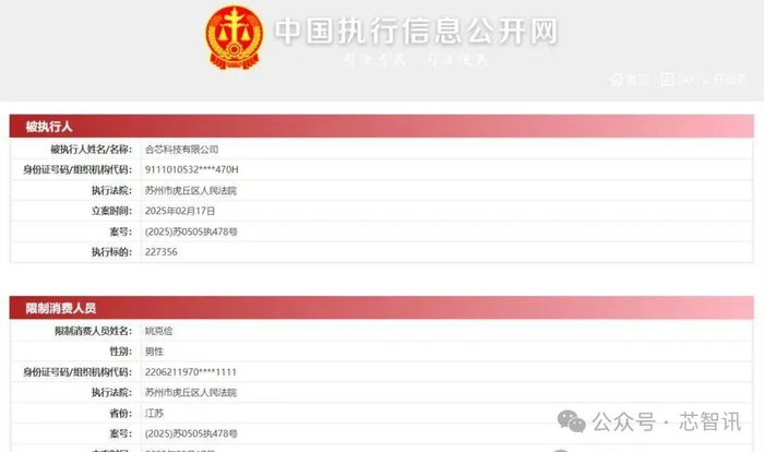 2025年2月25日,苏州市虎丘区人民法院对国产服务器CPU创业公司合芯科技法人代表暨董事长姚克俭发出限制消费令,禁止实施高消费及非生活和工作必需的消费行为。去年11月,合芯科技就曾被曝“拖欠员工薪资半年之久”、“公司几乎停摆”、“超过500名员工集体通过劳动仲裁维权”,爆料还显示,姚克俭目前已经失联。