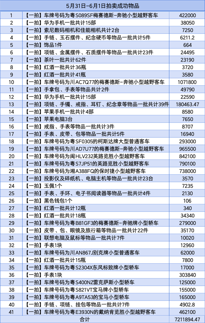 第一轮拍卖成功后,合计41件物品拍卖成功,合计收回721.18万左右。