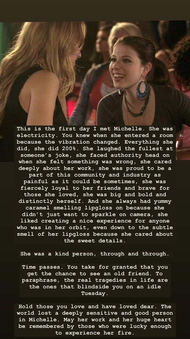 《绯闻女孩》的几位主人公也不约而同发文回忆过往与她相处的点滴。饰演主角塞丽娜的布蕾克·莱弗利更是在个人社交媒体上分享了两人第一次见面的照片并发长文悼念:“她一走进房间,你就能感到整个气氛为之一变。每一件事,她都会投入200%的精力去做。别人讲笑话的时候,她往往笑得最开心。当察觉有不公发生时,她敢于直面权威。她也非常关心表演的工作,为自己是这个行当的一员感到自豪,尽管有时工作可能会带来痛苦。她对朋友非常忠诚,为所爱的人无所畏惧。她总是涂着好闻的焦糖味唇彩,因为她不只想在镜头前发光,还喜欢为生活的轨道上相遇的每一个人创造美好的体验,所以就连唇彩那微妙的气味也不放过,她就是很在乎这些甜蜜的细节。”