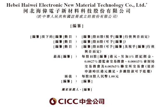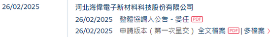 2025年2月26日,来自河北衡水的河北海伟电子新材料科技股份有限公司 Hebei Haiwei Electronic New Material Technology Co., Ltd.(简称“海伟电子新材料”)在港交所递交招股书,拟在香港主板上市。
