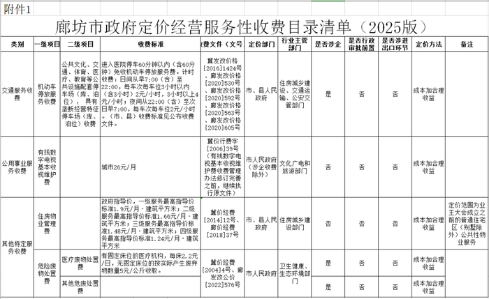 为进一步规范政府定价经营服务收费行为,持续优化营商环境,根据《河北省发展和改革委员会关于公布河北省政府定价经营服务性收费目录清单(2025版)的通知》(冀发改公价〔2025〕187号)精神和有关规定,我委对省授权市级人民政府定价的经营服务性收费政策进行了梳理,制定了《廊坊市政府定价经营服务性收费目录清单(2025版)》,予以公布,并将省目录清单转发给你们。原《廊坊市政府定价经营服务性收费目录清单(2024版)》(廊发改公价〔2023〕556号)同时废止。