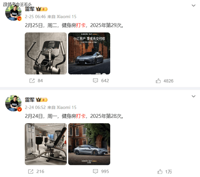 雷军还经常在社交平台上分享生活细节,如早餐内容、穿搭选择,今年还立下了2025年健身房打卡100次的健身flag,这种人设定位就与普通人非常接近。