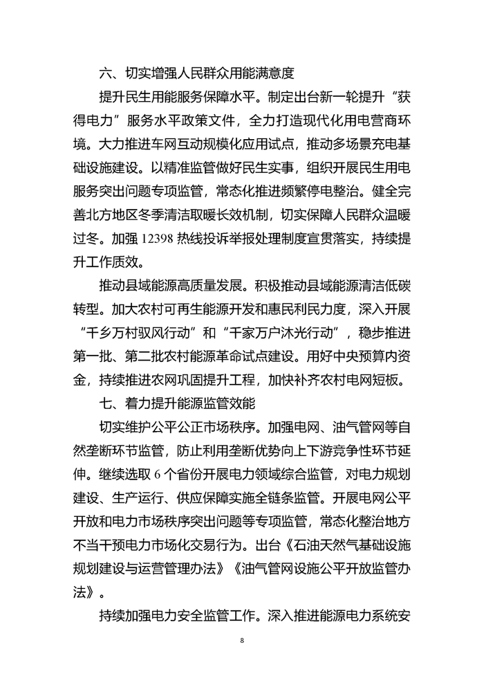 《指导意见》提出21项年度重点任务。一是从夯实能源安全保障基础、提高区域能源协同保障能力、强化能源安全重大风险管控三个方面,大力提升能源安全保障能力。二是从保持非化石能源良好发展态势、统筹推进新型电力系统建设、持续深化能源开发利用方式变革三个方面,积极稳妥推进能源绿色低碳转型。三是从持续完善能源体制机制、深化全国统一电力市场建设、不断健全能源法治体系三个方面,深入推进能源改革和法治建设。四是从持续完善能源科技创新体系、强化能源关键核心技术攻关、培育发展壮大能源新产业新业态三个方面,加快推动能源科技自立自强。五是从提升民生用能服务保障水平、推动县域能源高质量发展两个方面,切实增强人民群众用能满意度。六是从切实维护公平公正市场秩序、持续加强电力安全监管工作两个方面,着力提升能源监管效能。七是从持续增强海外资源供应保障能力、统筹做好重点国家和地区能源合作、积极参与全球能源治理三个方面,巩固深化能源国际合作。八是从加力完成“十四五”能源规划目标任务、科学谋划“十五五”能源规划两个方面,统筹推进能源规划编制实施。
