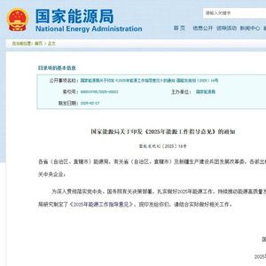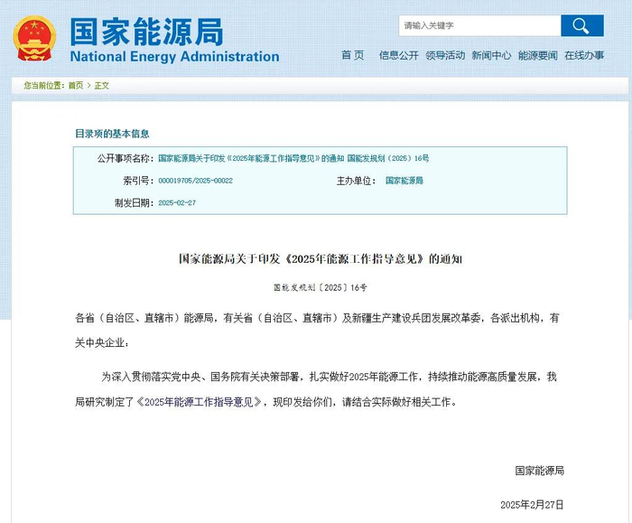 2025年2月27日,国家能源局发布关于印发《2025年能源工作指导意见》的通知。
