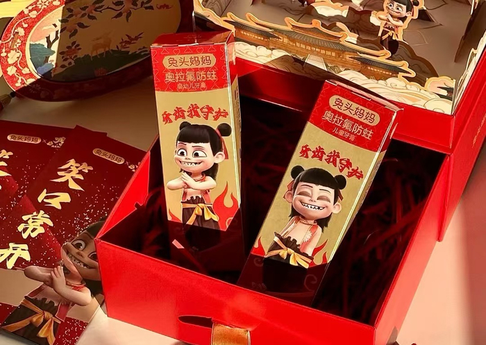 儿童洗护品牌兔头妈妈就是其中之一,它也是《哪吒2》一系列联名品牌中唯一的日化品牌。在《哪吒2》还未上映的1月初,兔头妈妈就在新品发布会上官宣了与哪吒IP的联名,并计划与楼宇广告商分众传媒合作,加大广告投放力度,集中资源打爆新品“高纯奥拉氟儿童防蛀牙膏”。