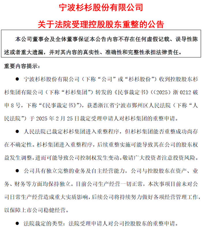 2月26日晚间,杉杉集团公告称,收到宁波市鄞州区人民法院于2025年2月25日裁定受理申请人对杉杉集团的重整申请。