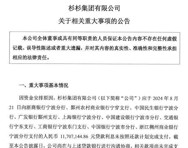 2024年8月28日,杉杉集团宣布原定于8月21日向多家银行支付的1170.7万元的贷款利息,未能如期完成支付。