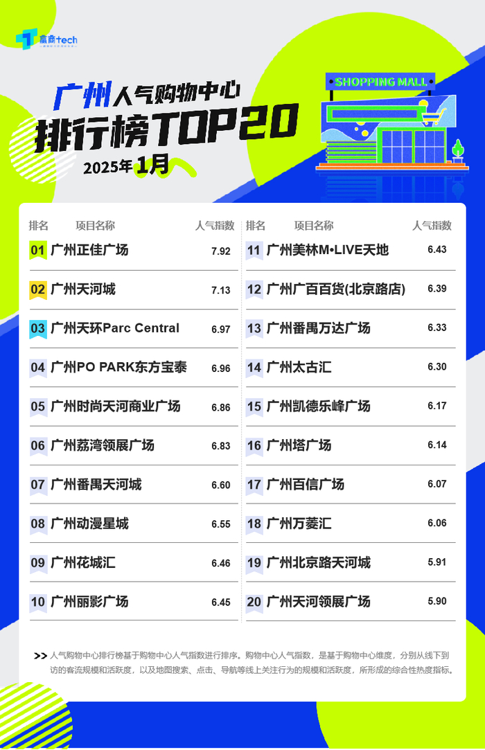 广州TOP20变化不大,9个人气商场“扎堆”天河路-珠江新城商圈,但也有惊喜之处。